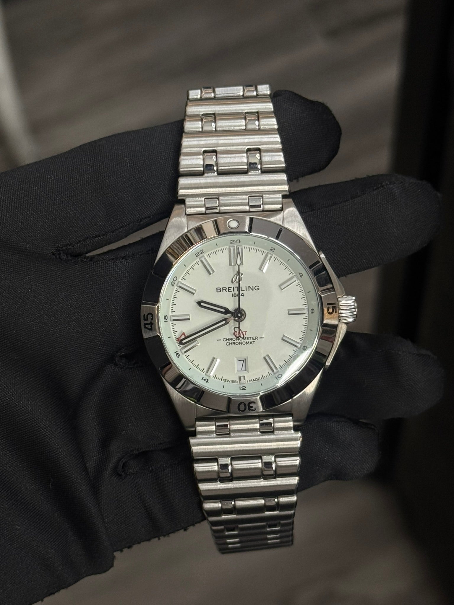Powered by the Breitling 32 self-winding mechanical movement with dual time zone (24-hour) function and approximately 42-hour power reserve.